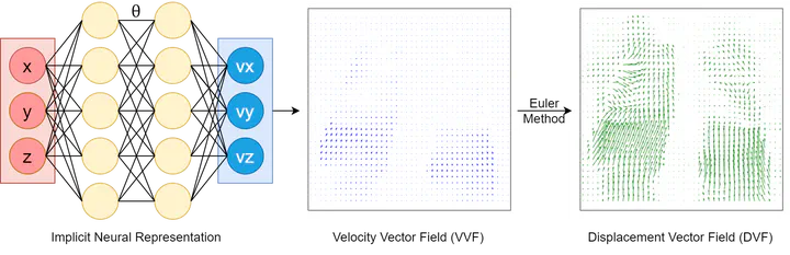 Background and purpose: Deformable image registration (DIR) is a crucial tool in radiotherapy for extracting and modelling organ motion. However, when significant changes and sliding boundaries are present, it faces compromised accuracy and uncertainty, determining the subsequential contour propagation and dose accumulation procedures. Materials and methods: We propose an implicit neural representation (INR)-based approach modelling motion continuously in both space and time, named Continues-sPatial-Temporal DIR (CPT-DIR). This method uses a multilayer perception (MLP) network to map 3D coordinate (x,y,z) to its corresponding velocity vector (vx,vy,vz). The displacement vectors (dx,dy,dz) are then calculated by integrating velocity vectors over time. The MLP’s parameters can rapidly adapt to new cases without pre-training, enhancing optimisation. The DIR’s performance was tested on the DIR-Lab dataset of 10 lung 4DCT cases, using metrics of landmark accuracy (TRE), contour conformity (Dice) and image similarity (MAE).